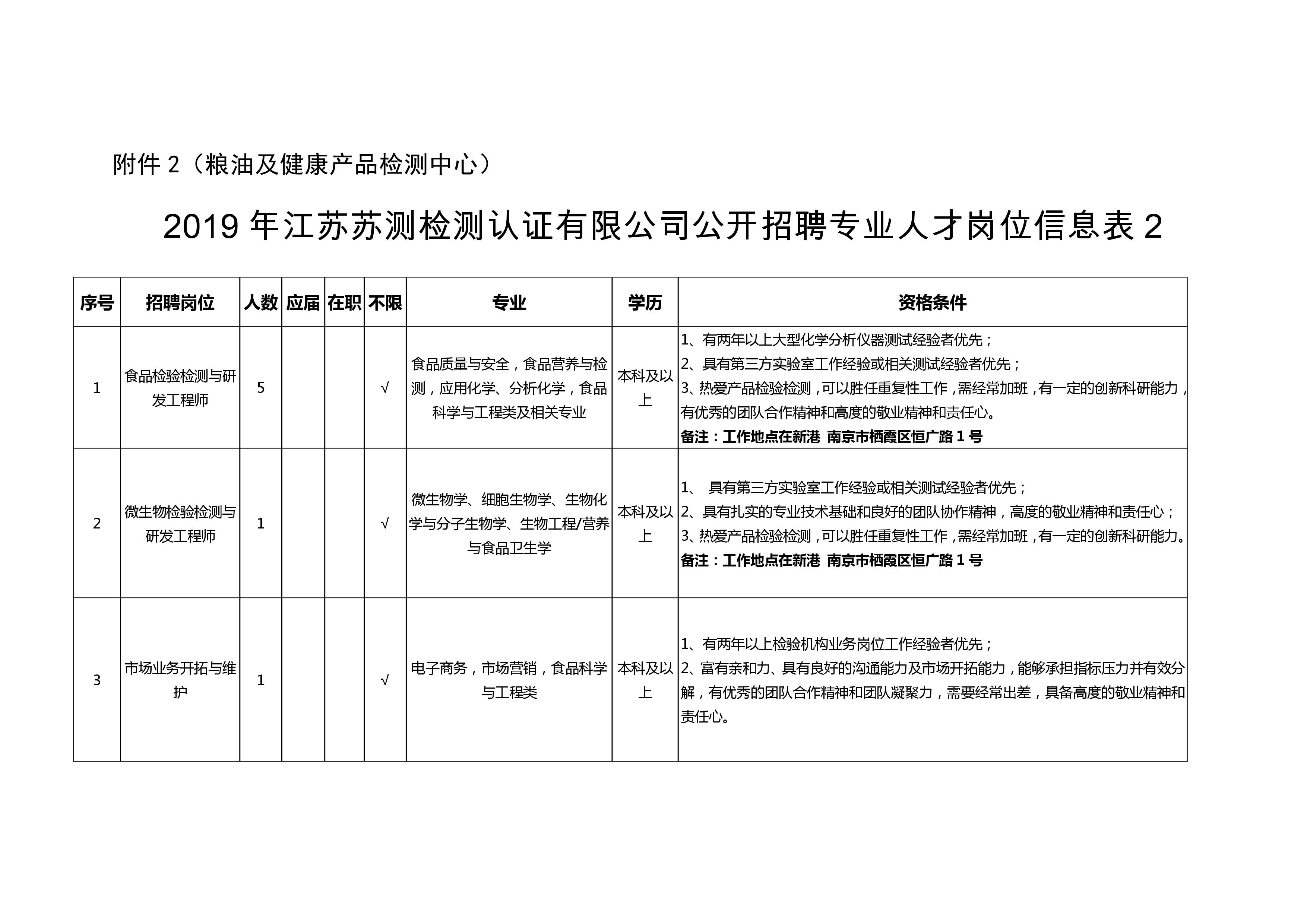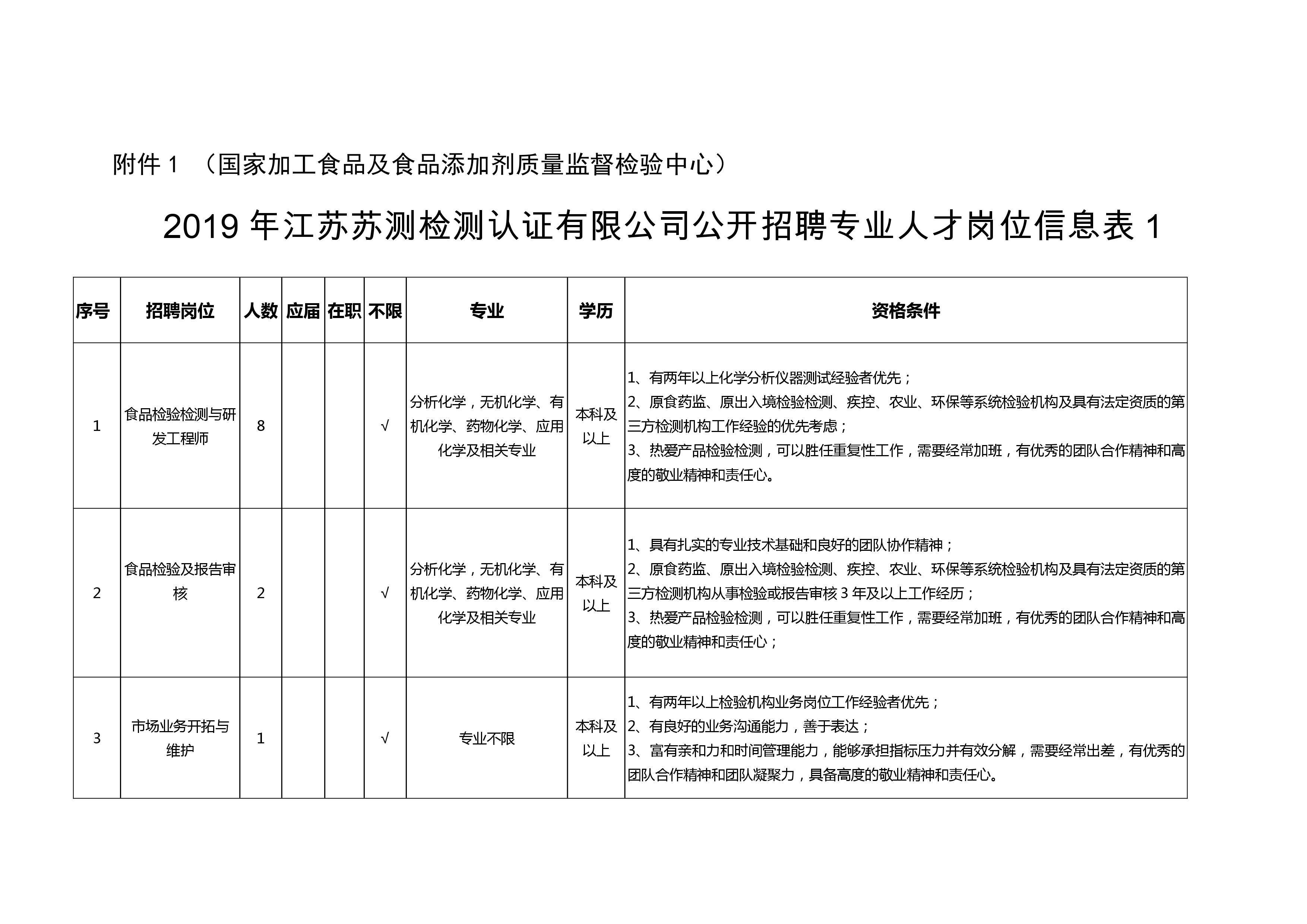 4.具備崗位資格條件(詳見(jiàn)附件1:《2019年江蘇蘇測(cè)檢測(cè)認(rèn)證有限公司公開(kāi)招聘專業(yè)人才崗位信息表》)